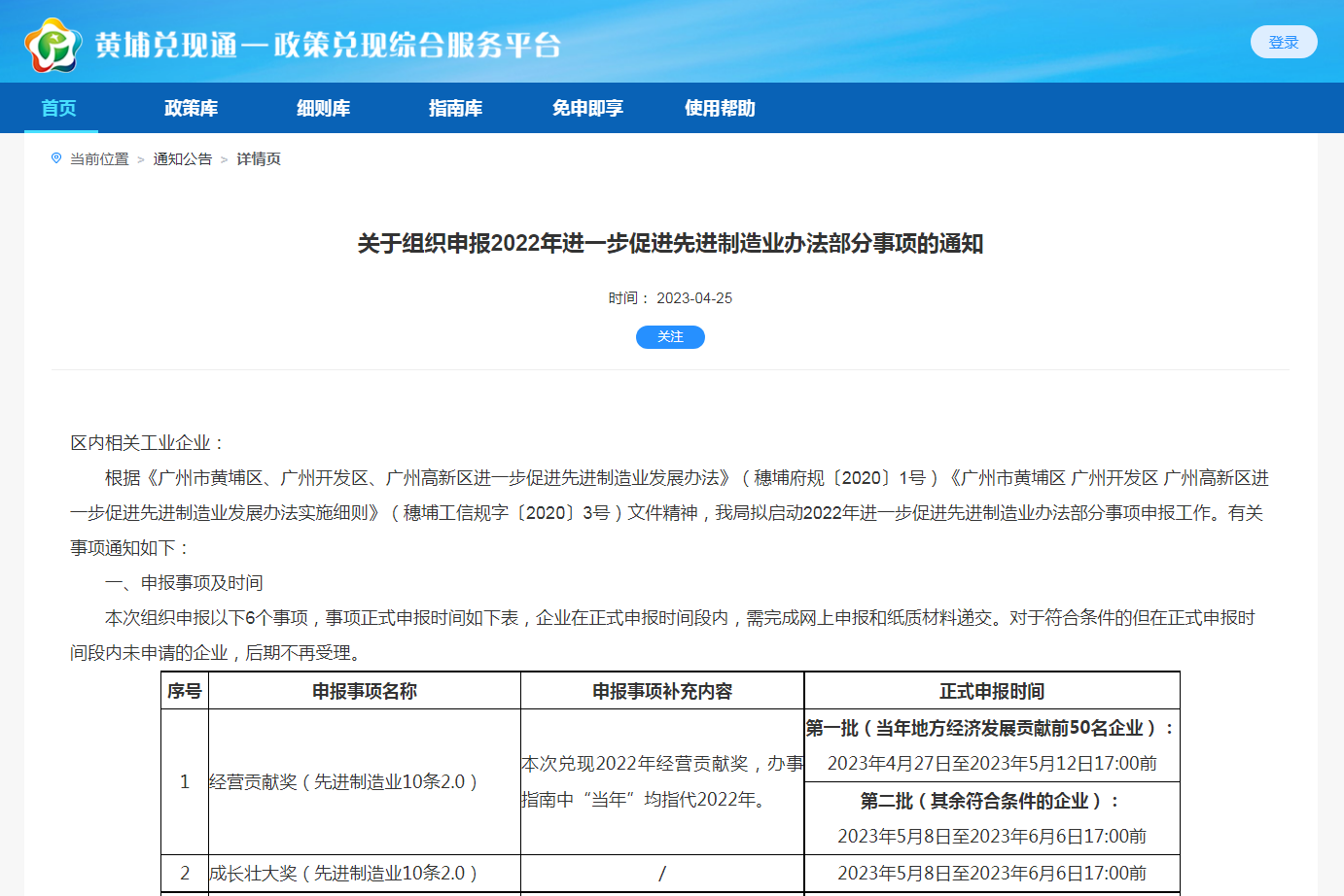 根据《广州市黄埔区、广州开发区、广州高新区进一步促进先进制造业发展办法》(穗埔府规〔2020〕1号)《广州市黄埔区 广州开发区 广州高新区进一步促进先进制造业发展办法实施细则》(穗埔工信规字〔2020〕3号)文件精神,我局拟启动2022年进一步促进先进制造业办法部分事项申报工作。有关事项通知如下: