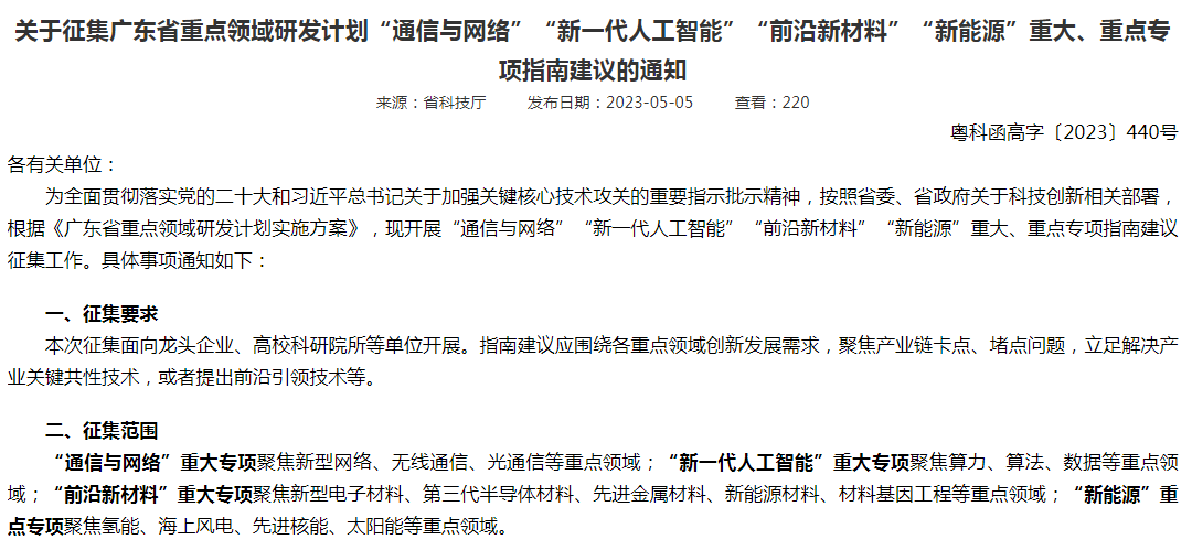 为全面贯彻落实党的二十大和习近平总书记关于加强关键核心技术攻关的重要指示批示精神,按照省委、省政府关于科技创新相关部署,根据《广东省重点领域研发计划实施方案》,现开展“通信与网络”“新一代人工智能”“前沿新材料”“新能源”重大、重点专项指南建议征集工作。具体事项通知如下: