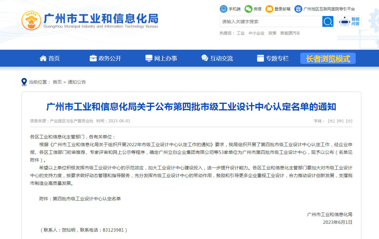 根据《广州市工业和信息化局关于组织开展2022年市级工业设计中心认定工作的通知》要求,我局组织开展了第四批市级工业设计中心认定工作,经企业申报、各区工信部门初审推荐、专家评审和网上公示等程序,确定广州立白企业集团有限公司等53家单位为广州市第四批市级工业设计中心,现予以公布(名单见附件)。