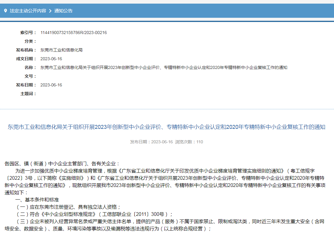 东莞市工业和信息化局关于组织开展2023年创新型中小企业评价、专精特新中小企业认定和2020年专精特新中小企业复核工作的通知