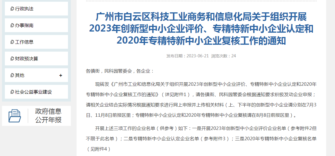 广州市白云区科技工业商务和信息化局关于组织开展2023年创新型中小企业评价、专精特新中小企业认定和2020年专精特新中小企业复核工作的通知