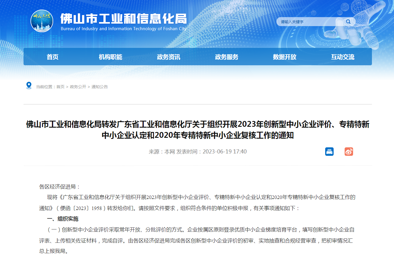 佛山市工业和信息化局转发广东省工业和信息化厅关于组织开展2023年创新型中小企业评价、专精特新中小企业认定和2020年专精特新中小企业复核工作的通知