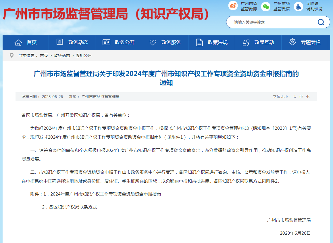 广州市市场监督管理局关于印发2024年度广州市知识产权工作专项资金资助资金申报指南的通知