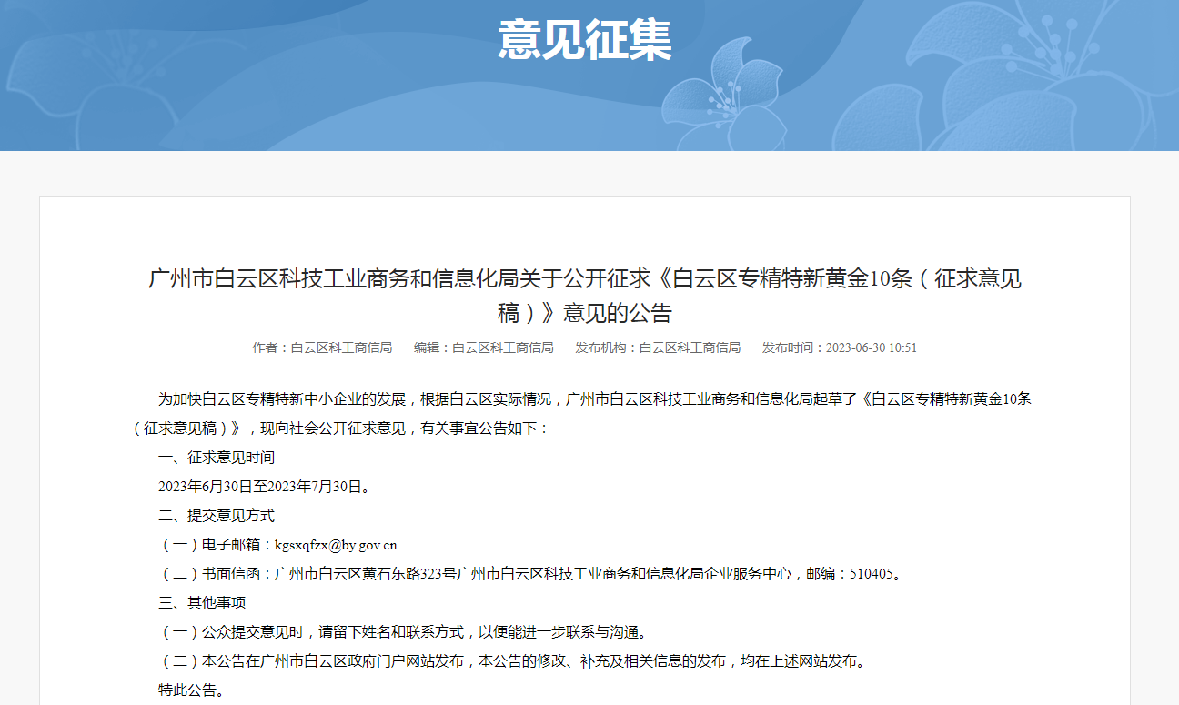 广州市白云区科技工业商务和信息化局关于公开征求《白云区专精特新黄金10条(征求意见稿)》意见的公告