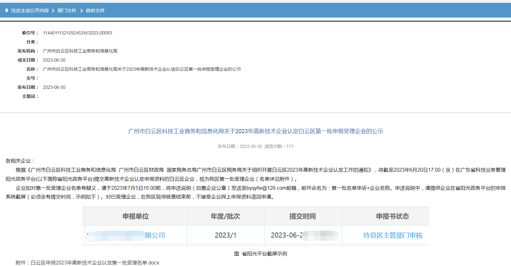 根据《广州市白云区科技工业商务和信息化局 广州市白云区财政局 国家税务总局广州市白云区税务局关于组织开展白云区2023年高新技术企业认定工作的通知》,将截至2023年6月20日17:00(含)在广东省科技业务管理阳光政务平台(以下简称省阳光政务平台)提交高新技术企业认定申报资料的白云区企业,视为我区第一批受理企业(名单详见附件)。