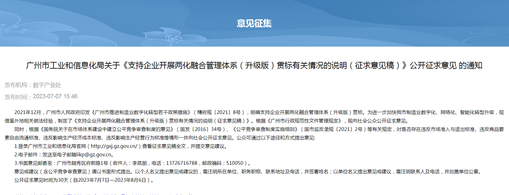 广州市工业和信息化局关于《支持企业开展两化融合管理体系(升级版)贯标有关情况的说明(征求意见稿)》公开征求意见 的通知