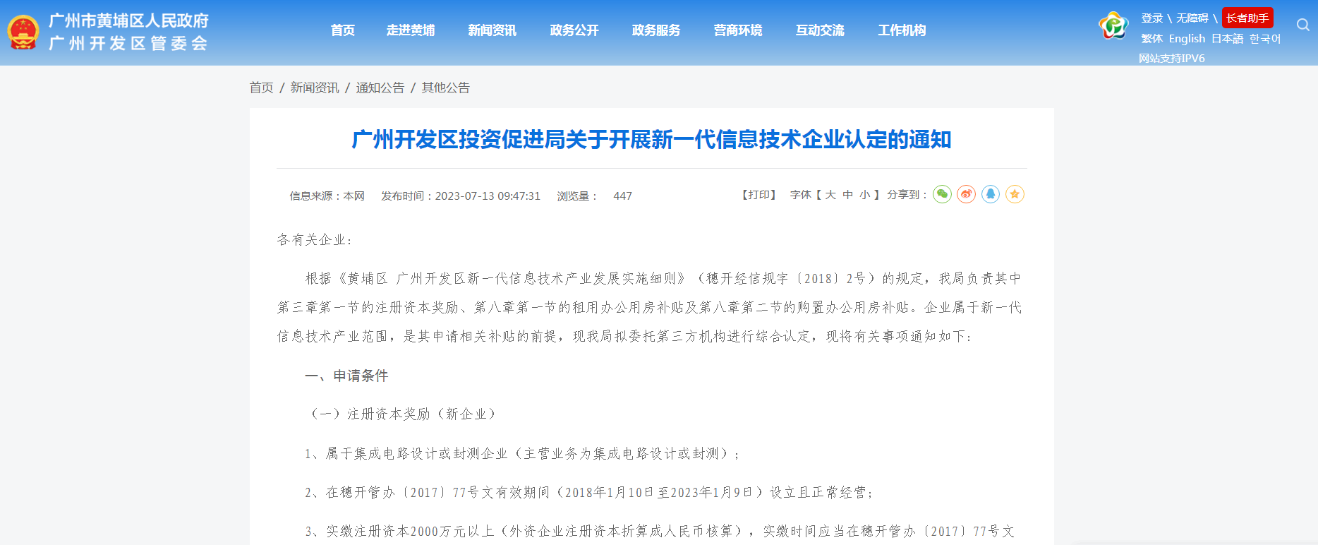 广州开发区投资促进局关于开展新一代信息技术企业认定的通知