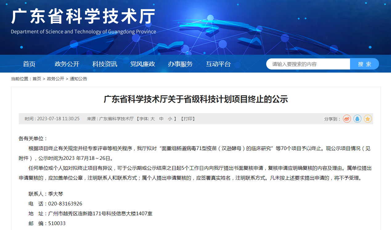 湾企服政策指引:根据项目终止有关规定并经专家评审等相关程序,我厅拟对“面重组肠道病毒71型疫苗(汉逊酵母)的临床研究”等70个项目予以终止。