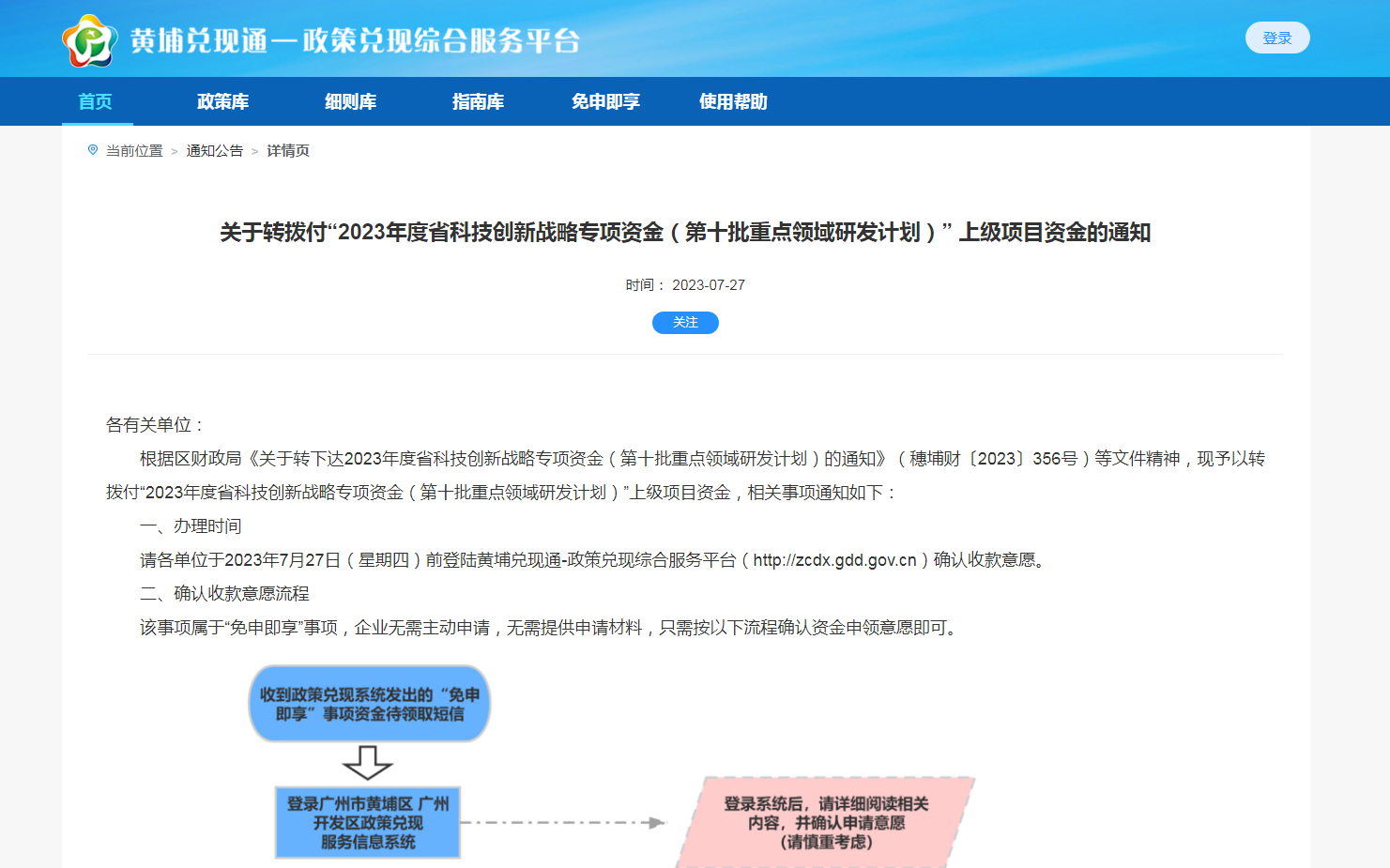 请各单位于2023年7月27日(星期四)前登陆黄埔兑现通-政策兑现综合服务平台(http://zcdx.gdd.gov.cn)确认收款意愿。
