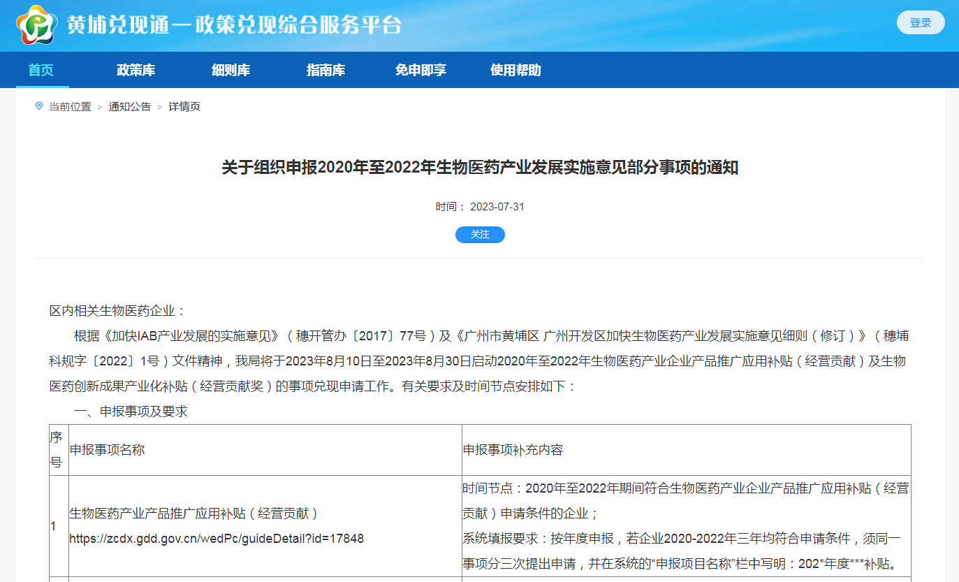 生物医药产业产品推广应用补贴(经营贡献)https://zcdx.gdd.gov.cn/wedPc/guideDetail?id=17848 |