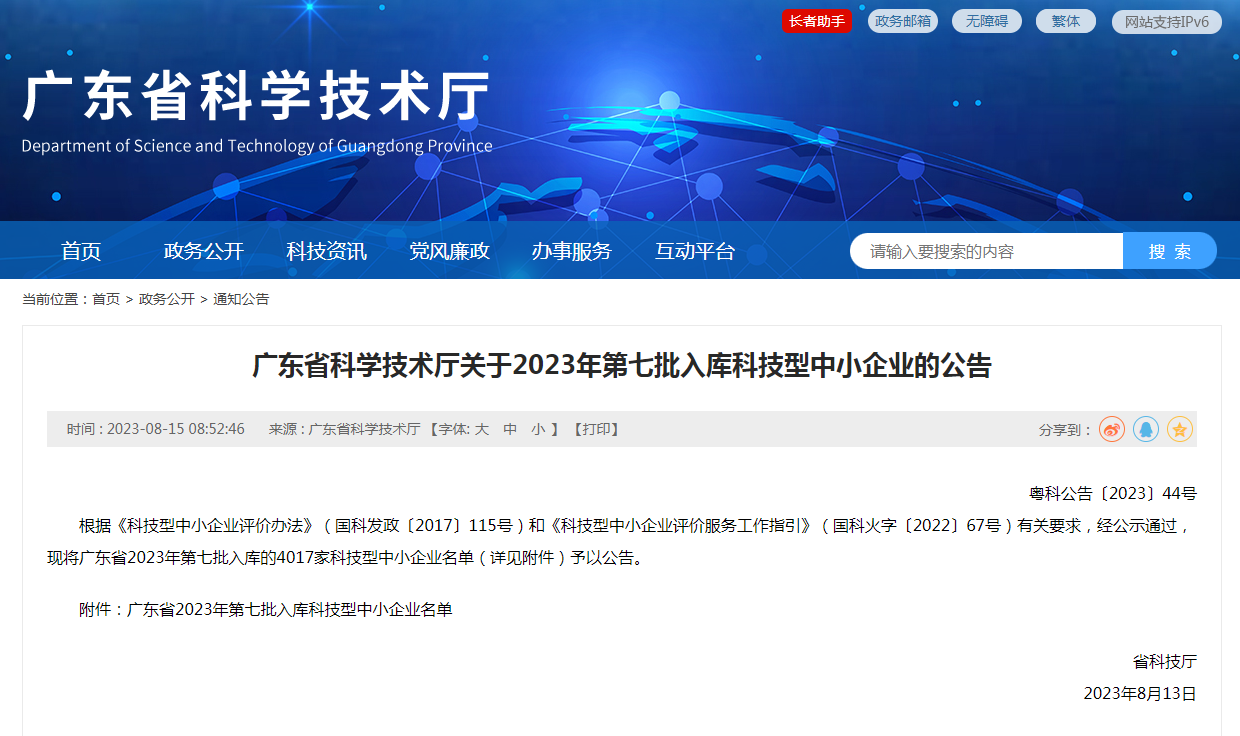 广东省科学技术厅关于2023年第七批入库科技型中小企业的公告