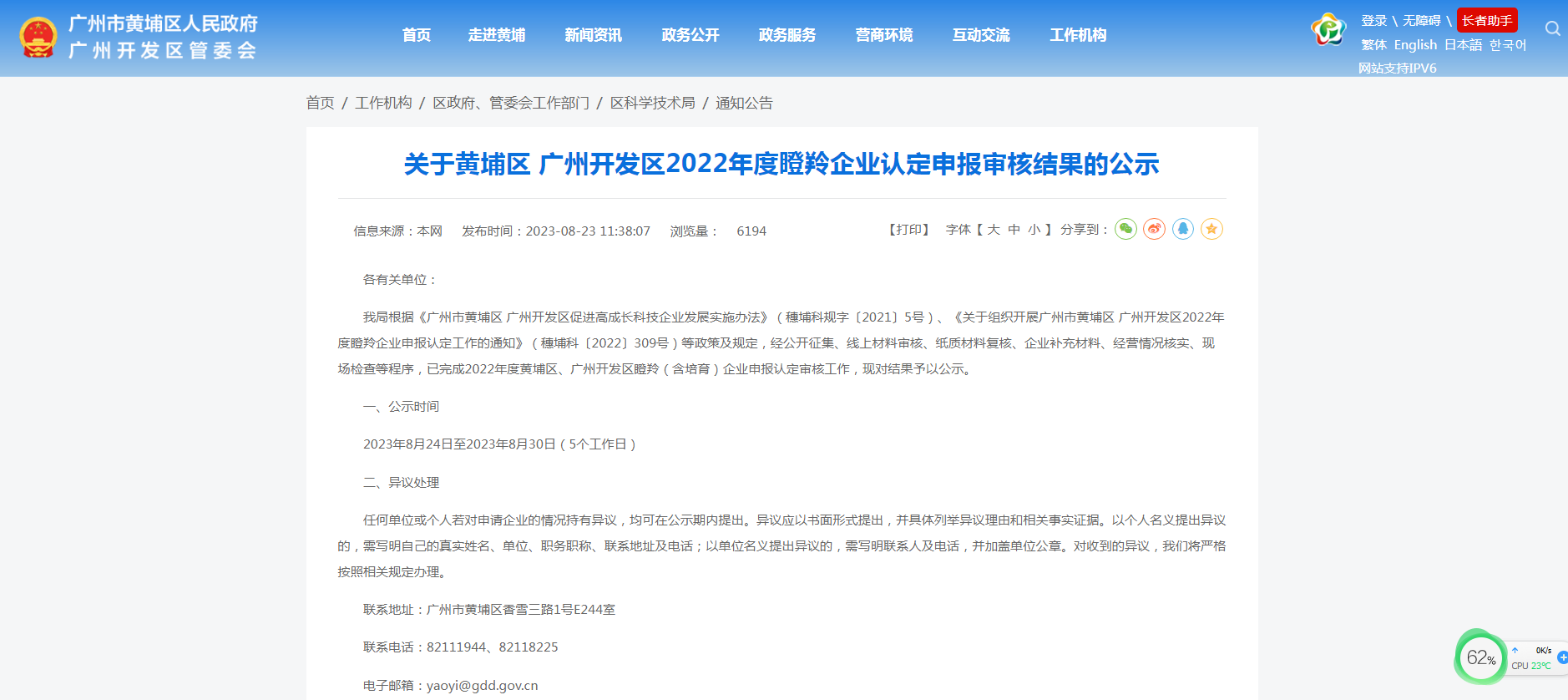 关于黄埔区 广州开发区2022年度瞪羚企业认定申报审核结果的公示