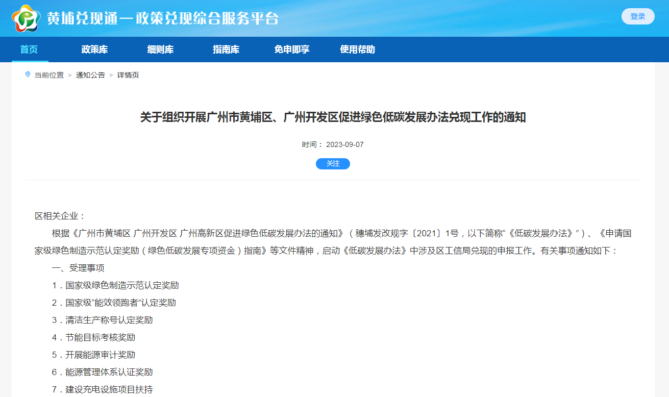 湾企服政策指引:根据《广州市黄埔区 广州开发区 广州高新区促进绿色低碳发展办法的通知》(穗埔发改规字〔2021〕1号,以下简称“《低碳发展办法》”)、《申请国家级绿色制造示范认定奖励(绿色低碳发展专项资金)指南》等文件精神,启动《低碳发展办法》中涉及区工信局兑现的申报工作。