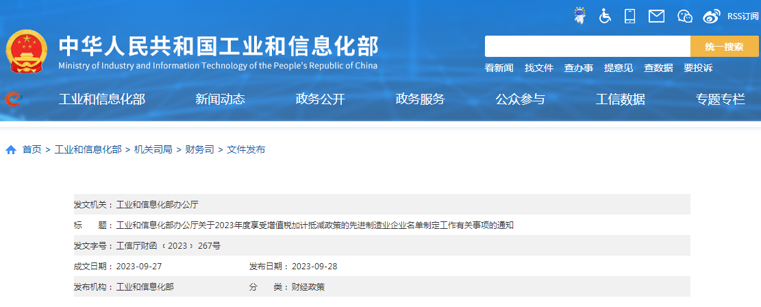 工业和信息化部办公厅关于2023年度享受增值税加计抵减政策的先进制造业企业名单制定工作有关事项的通知