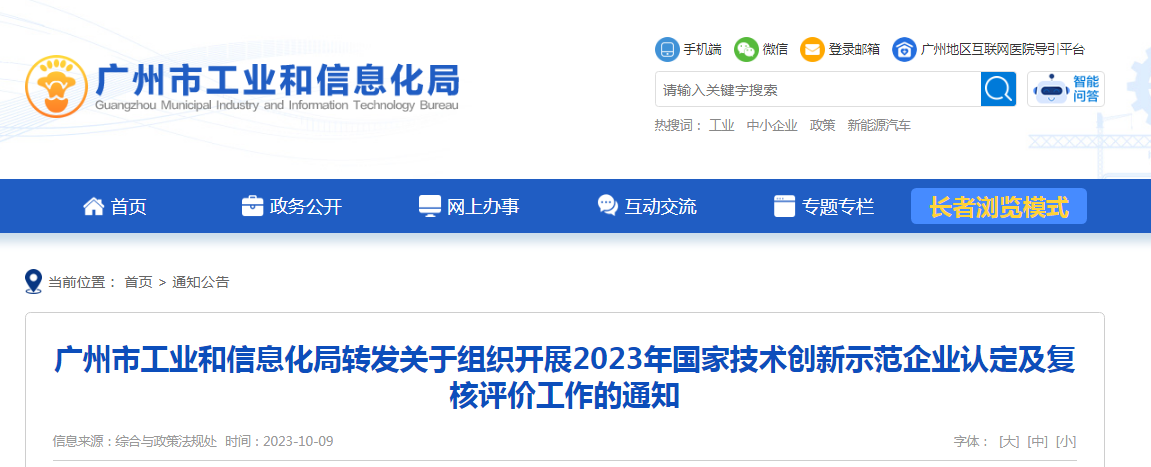 广州市工业和信息化局转发关于组织开展2023年国家技术创新示范企业认定及复核评价工作的通知