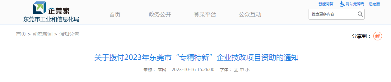 关于拨付2023年东莞市“专精特新”企业技改项目资助的通知