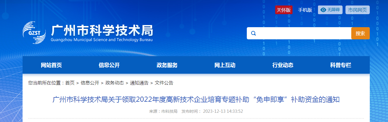 广州市科学技术局关于领取2022年度高新技术企业培育专题补助“免申即享”补助资金的通知