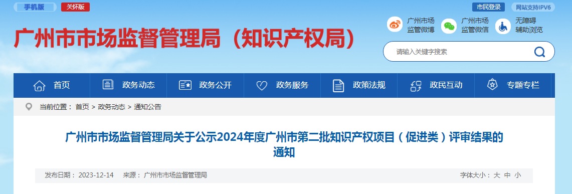 广州市市场监督管理局关于公示2024年度广州市第二批知识产权项目(促进类)评审结果的通知