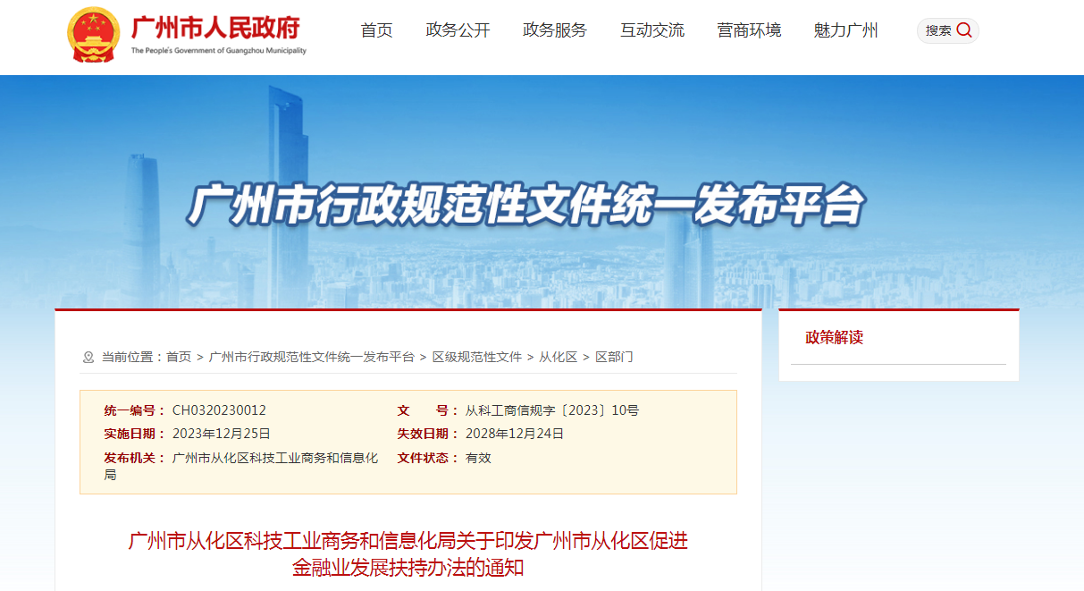 湾企服政策指引:《广州市从化区促进金融业发展扶持办法》已经区政府同意,现印发给你们,请认真组织实施。实施中遇到的问题,请径向区科工商信局反映。