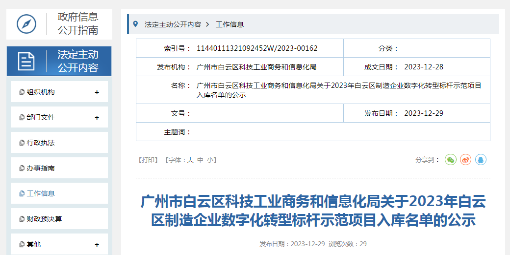 广州市白云区科技工业商务和信息化局关于2023年白云区制造企业数字化转型标杆示范项目入库名单的公示