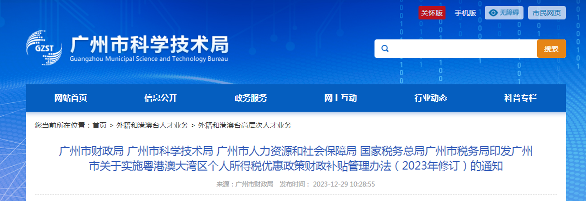 广州市财政局 广州市科学技术局 广州市人力资源和社会保障局 国家税务总局广州市税务局印发广州市关于实施粤港澳大湾区个人所得税优惠政策财政补贴管理办法(2023年修订)的通知