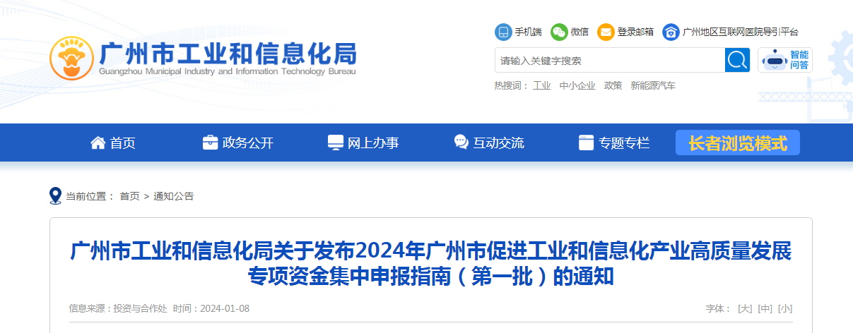 广州市工业和信息化局关于发布2024年广州市促进工业和信息化产业高质量发展专项资金集中申报指南(第一批)的通知