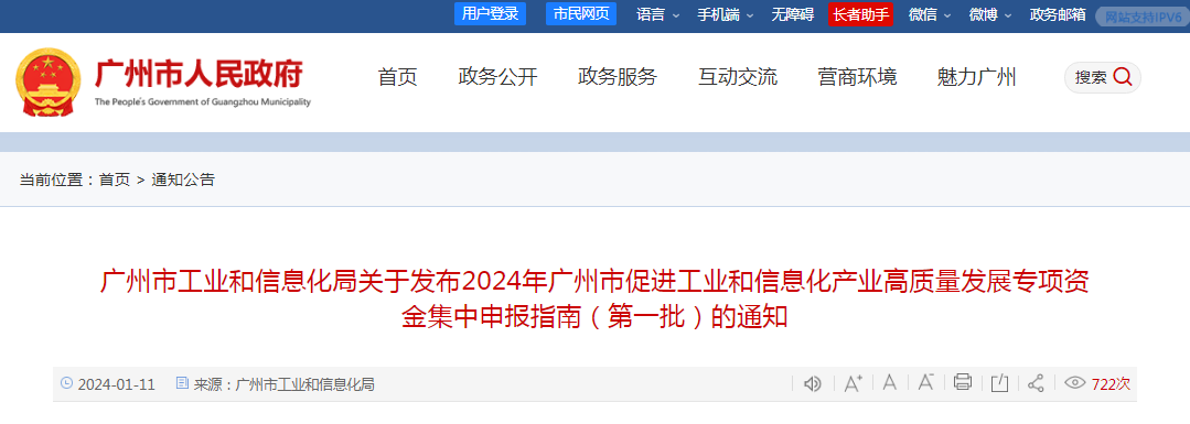 广州市工业和信息化局关于发布2024年广州市促进工业和信息化产业高质量发展专项资金集中申报指南(第一批)的通知