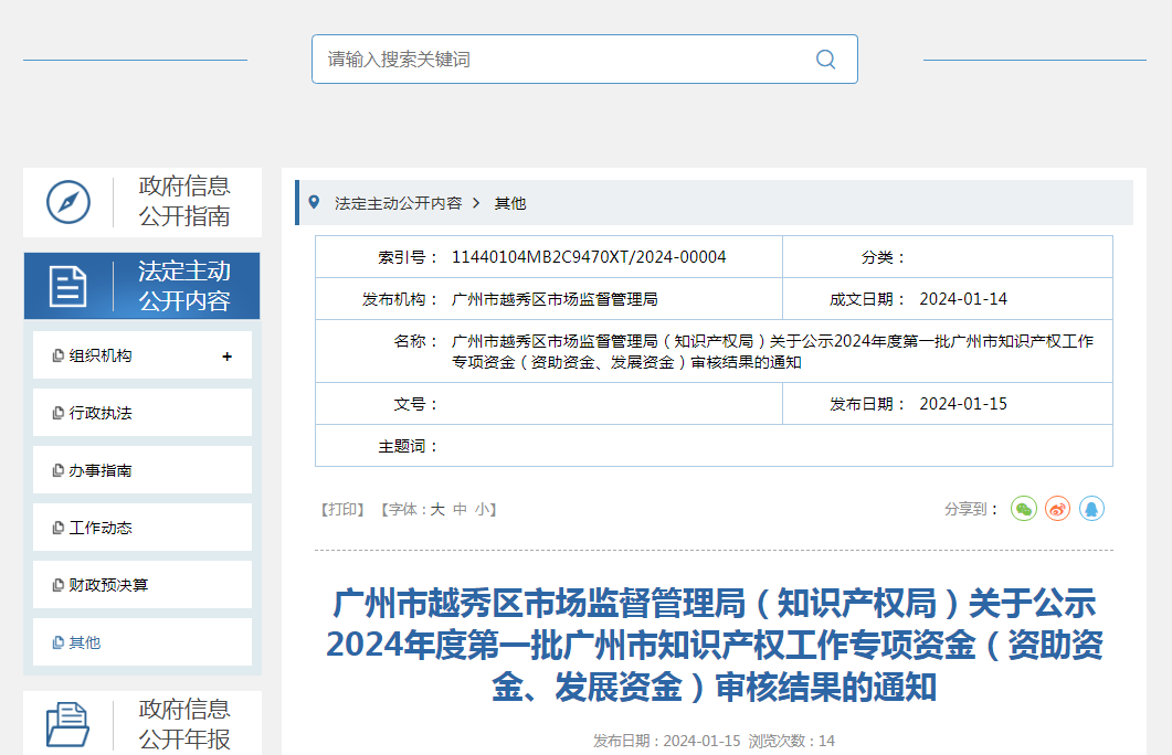 广州市越秀区市场监督管理局(知识产权局)关于公示2024年度第一批广州市知识产权工作专项资金(资助资金、发展资金)审核结果的通知