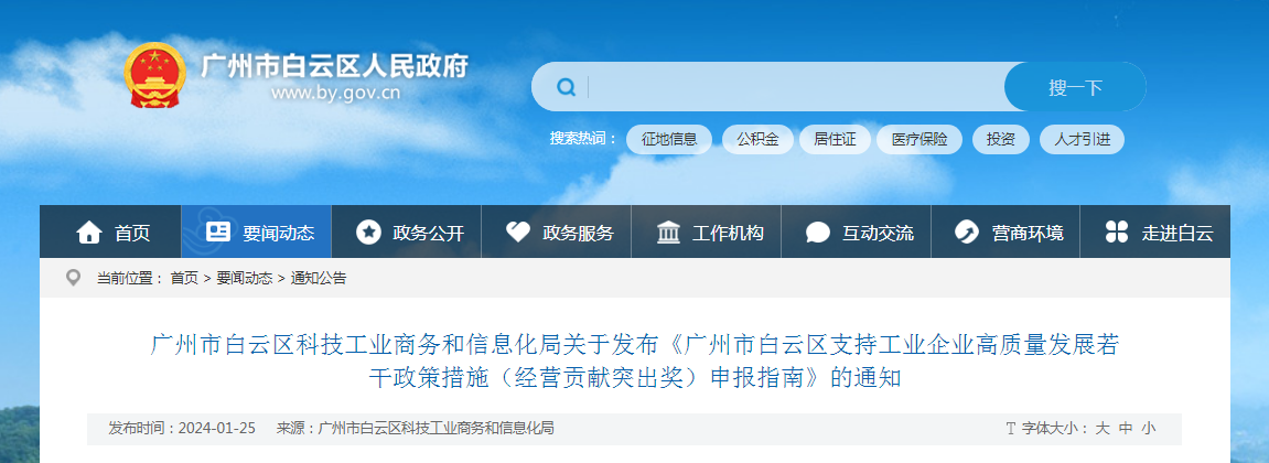 广州市白云区科技工业商务和信息化局关于发布《广州市白云区支持工业企业高质量发展若干政策措施(经营贡献突出奖)申报指南》的通知