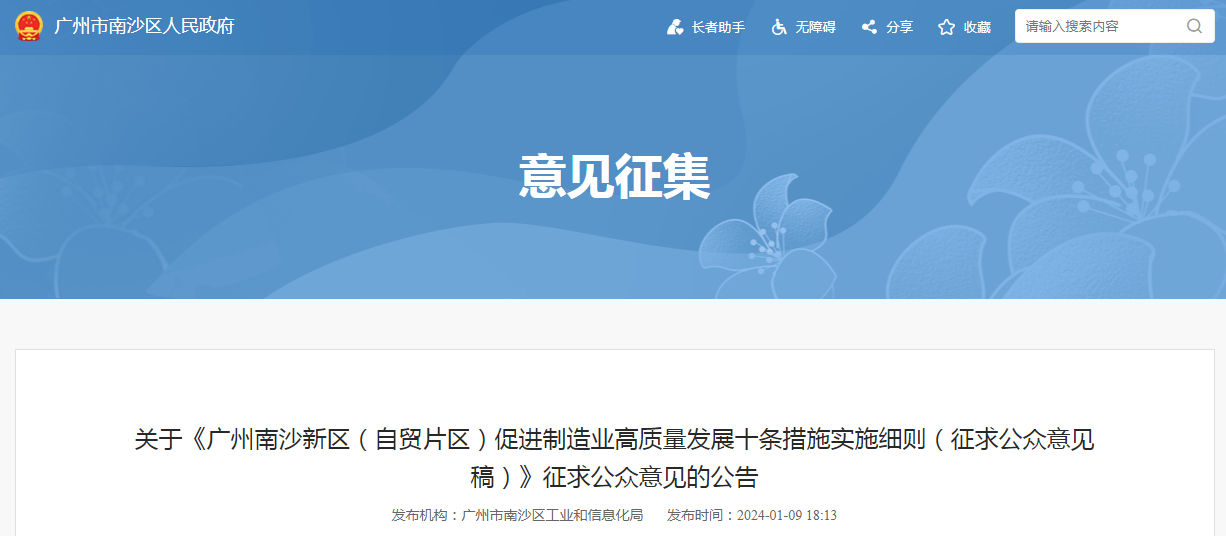 关于《广州南沙新区(自贸片区)促进制造业高质量发展十条措施实施细则(征求公众意见稿)》征求公众意见的公告