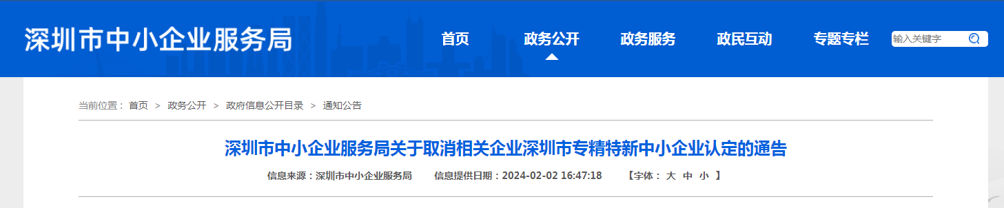 湾企服政策指引:关于取消相关企业深圳市专精特新中小企业认定的通告。