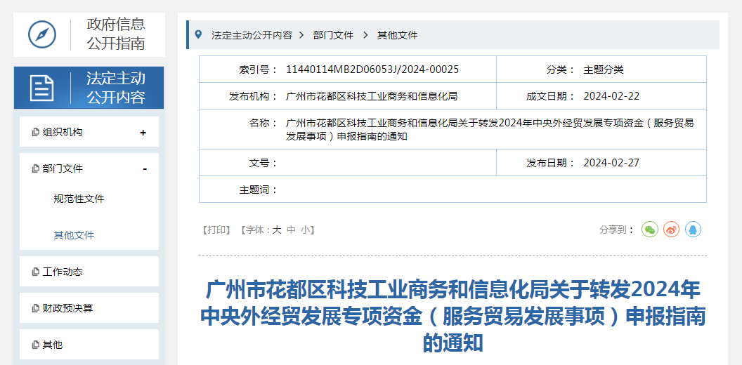 广州市花都区科技工业商务和信息化局关于转发2024年中央外经贸发展专项资金(服务贸易发展事项)申报指南的通知