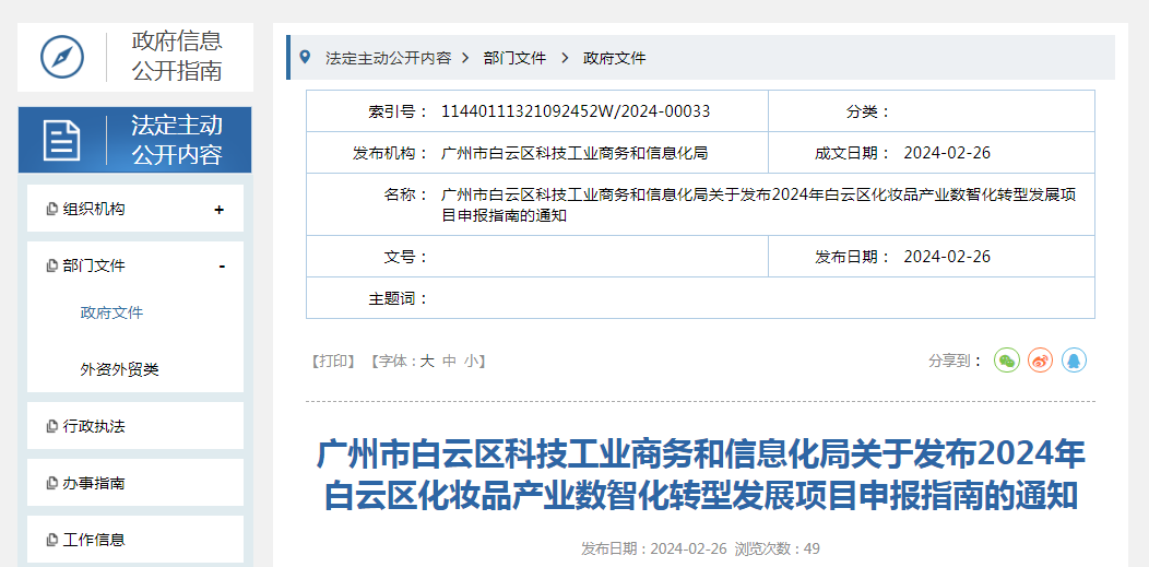 广州市白云区科技工业商务和信息化局关于发布2024年白云区化妆品产业数智化转型发展项目申报指南的通知