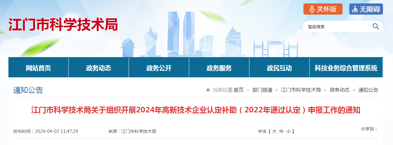 江门市科学技术局关于组织开展2024年高新技术企业认定补助(2022年通过认定)申报工作的通知
