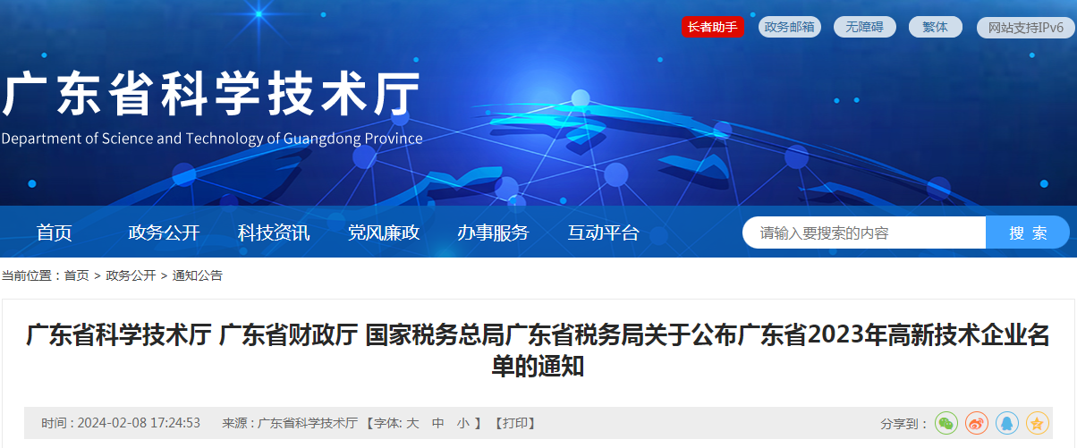 广东省科学技术厅 广东省财政厅 国家税务总局广东省税务局关于公布广东省2023年高新技术企业名单的通知