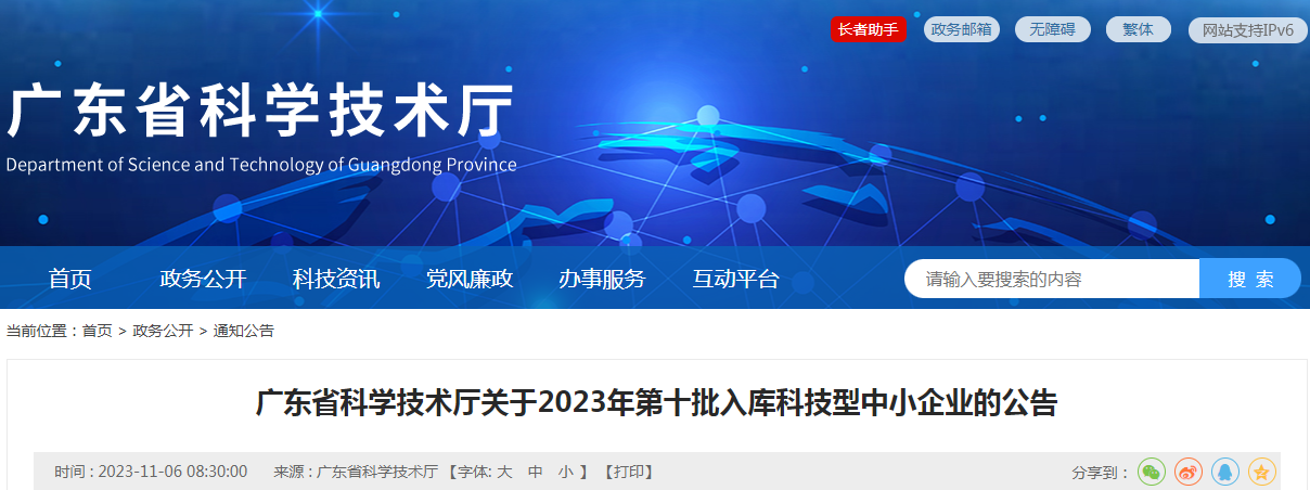 广东省科学技术厅关于2023年第十批入库科技型中小企业的公告
