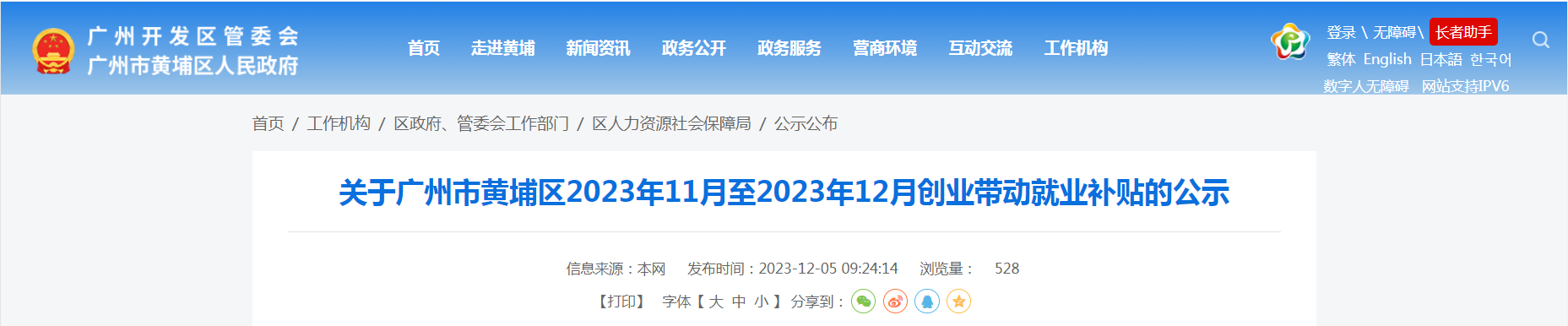 关于广州市黄埔区2023年11月至2023年12月创业带动就业补贴的公示
