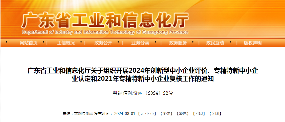 新修订的《广东省优质中小企业梯度培育管理实施细则》已于近期印发,根据工作安排,现组织开展2024年创新型中小企业评价、专精特新中小企业认定和2021年专精特新中小企业复核工作。有关事项通知如下: