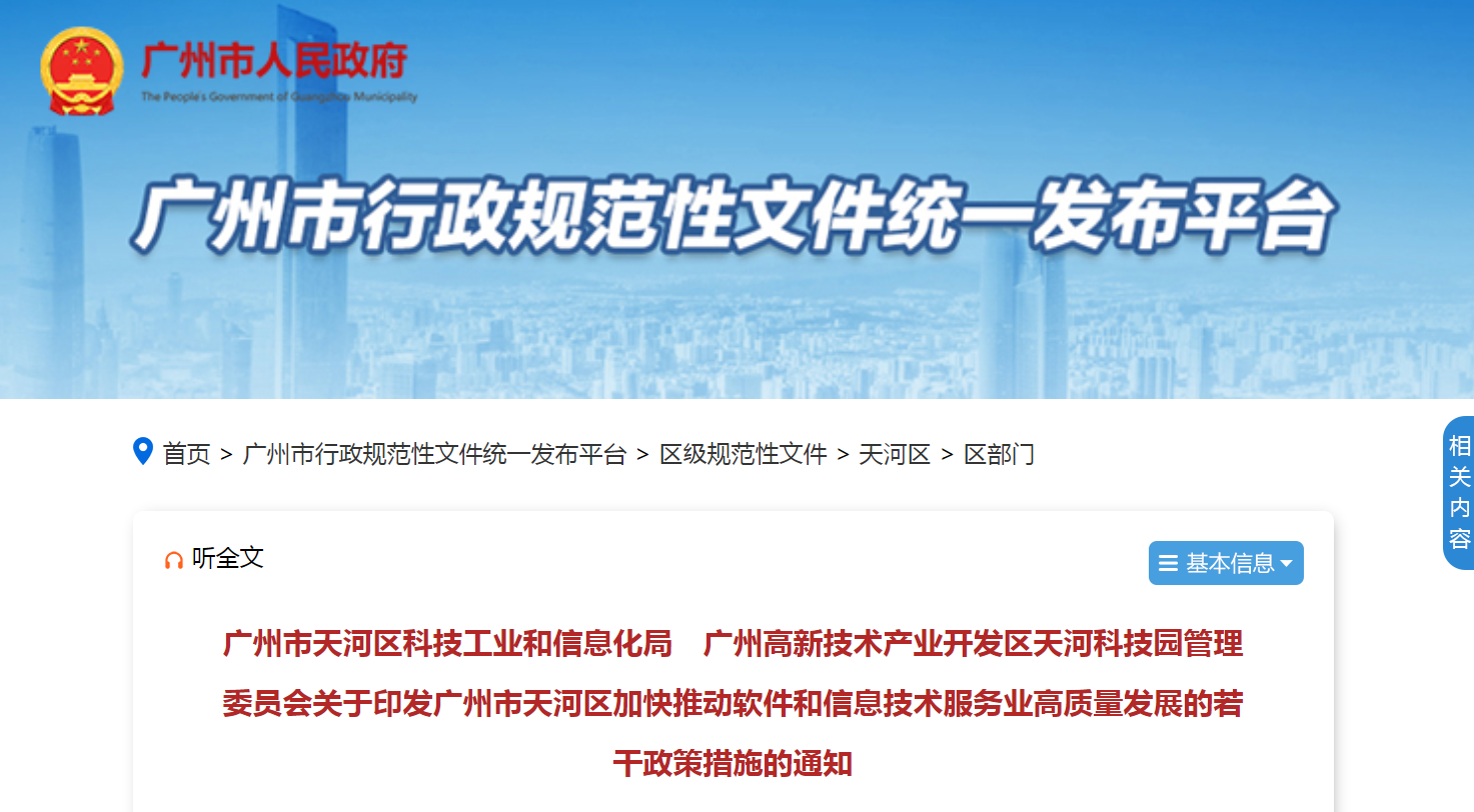 湾企服政策指引:广州市天河区加快推动软件和信息技术服务业高质量发展的若干政策措施的通知。