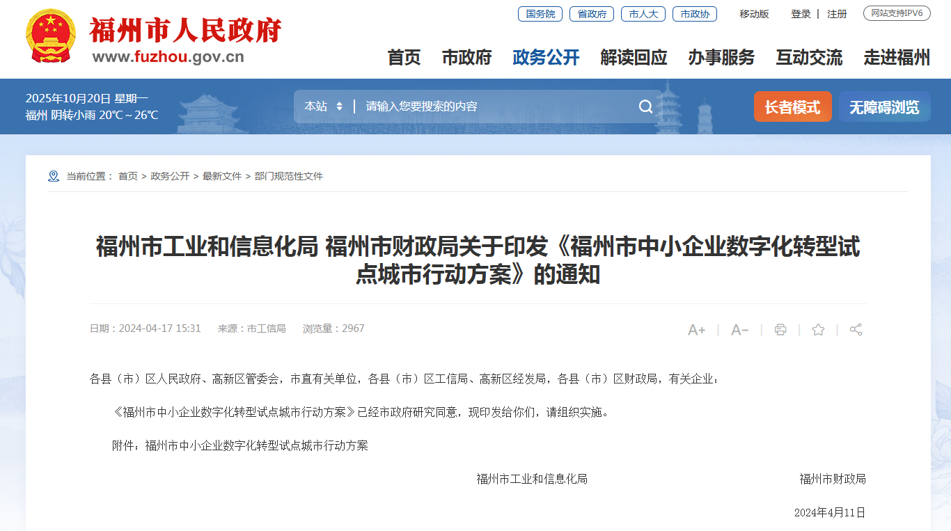福州市工业和信息化局 福州市财政局关于印发《福州市中小企业数字化转型试点城市行动方案》的通知