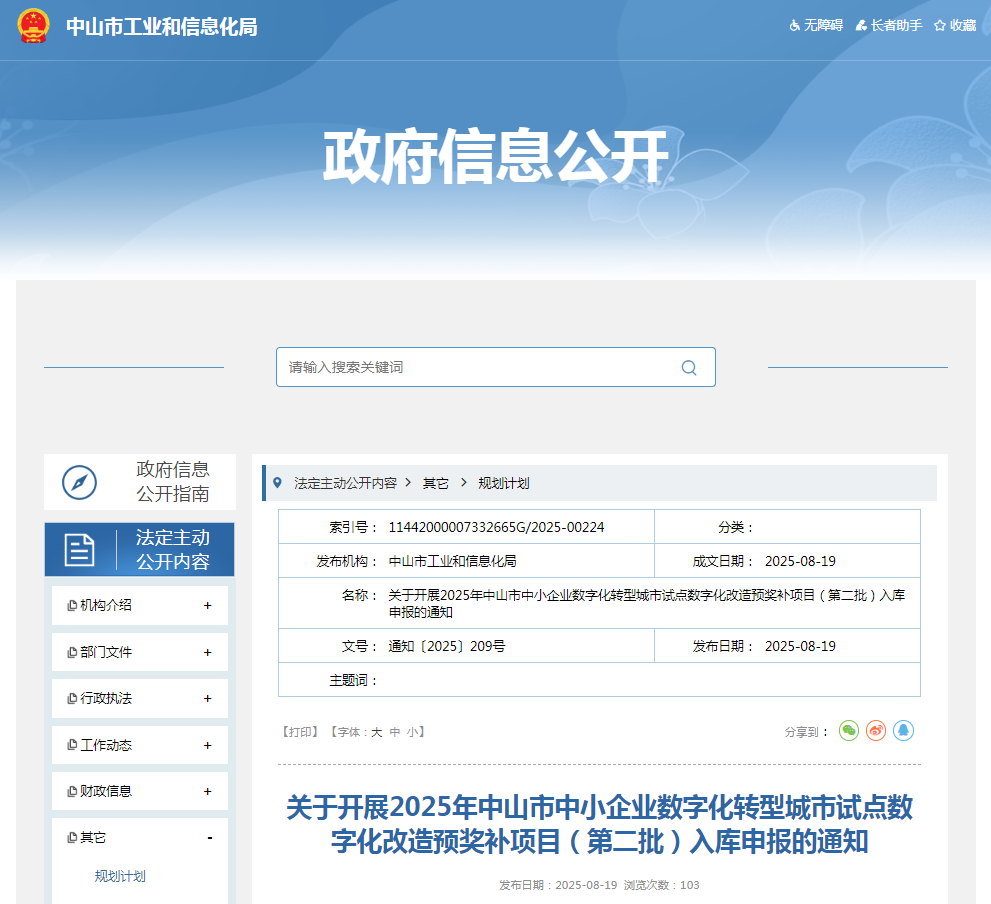 根据国家、省关于中小企业数字化转型城市试点有关工作部署,以及《中山市中小企业数字化转型城市试点工作方案》《中山市中小企业数字化转型城市试点专项资金项目实施细则》等有关要求,为加快推动试点行业中小企业数字化改造,支持企业项目建设,现对2025年中小企业数字化转型城市试点数字化改造预奖补项目(第二批)入库申报工作补充通过如下: