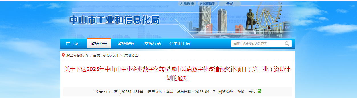 关于下达2025年中山市中小企业数字化转型城市试点数字化改造预奖补项目(第二批)资助计划的通知