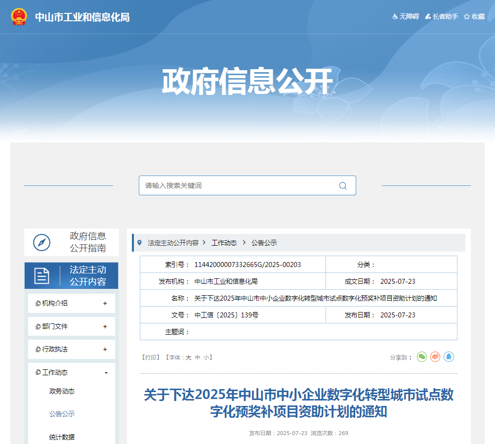 关于下达2025年中山市中小企业数字化转型城市试点数字化预奖补项目资助计划的通知