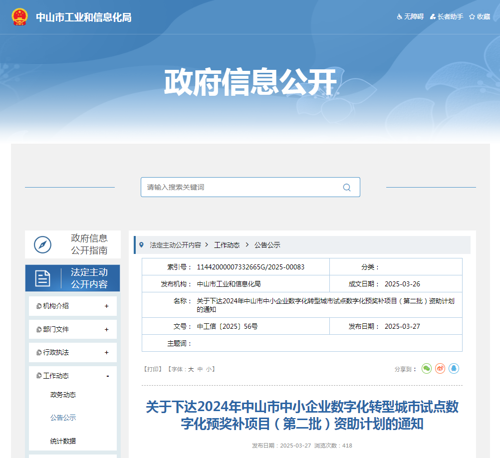 关于下达2024年中山市中小企业数字化转型城市试点数字化预奖补项目(第二批)资助计划的通知