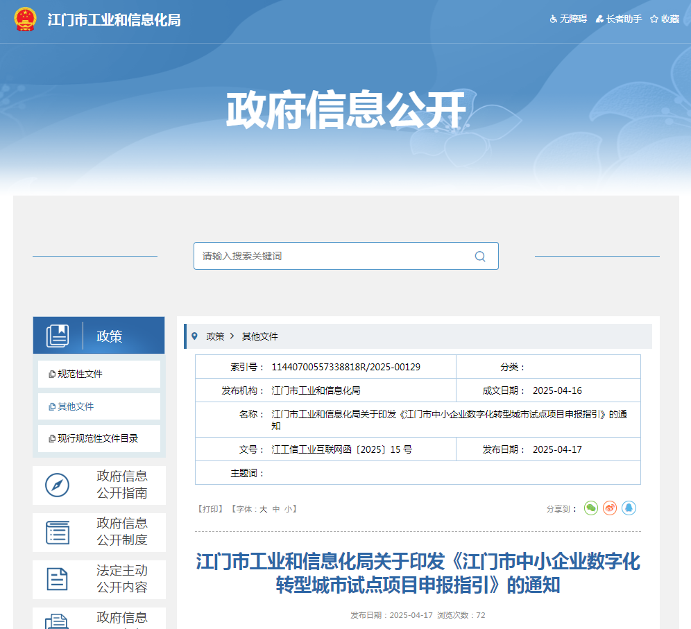为帮助企业高效完成江门市中小企业数字化转型城市试点申报工作,根据《江门市工业和信息化局关于征集江门市中小企业数字化转型城市试点数字化改造项目的通知》(江工信工业互联网〔2024〕11号)、《江门市工业和信息化局关于组织江门市中小企业数字化转型城市试点项目入库申报的通知》(江工信工业互联网函〔2025〕6号)、《江门市工业和信息化局关于做好江门市“政银保”融资项目促进制造业数字化转型贷款贴息项目入库申报工作的通知》(江工信工业互联网函〔2024〕46号)等文件,我局制定了《江门市中小企业数字化转型城市试点项目申报指引》,现印发给你们,如执行中遇到问题,请及时向我局反映。