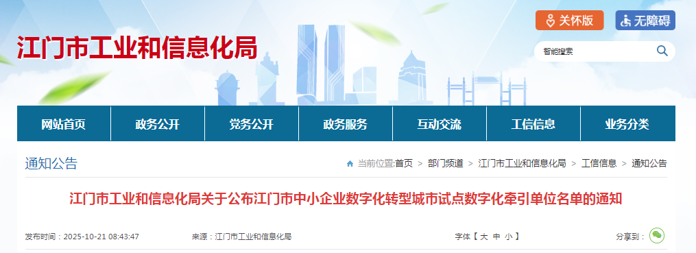 为加快推进江门市国家级、省级中小企业数字化转型城市试点建设工作,推动我市中小企业数字化转型,根据《江门市工业和信息化局关于开展江门市中小企业数字化转型城市试点数字化牵引单位遴选工作的通知》(江工信工业互联函〔2025〕28号)等文件要求,我局组织开展了江门市中小企业数字化转型城市试点数字化牵引单位遴选工作。经企业申报、专家评审、公示等流程,确定了江门市中小企业数字化转型城市试点数字化牵引单位名单,现将名单予以公布(见附件)。