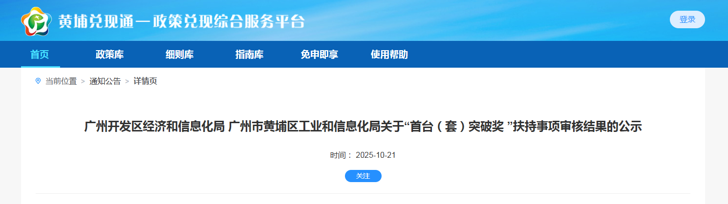 根据《广州市黄埔区人民政府 广州开发区管委会关于印发广州开发区(黄埔区)促进经济高质量发展政策措施的通知》(穗埔府规〔2024〕5号)、《申请首台(套)突破奖扶持(高质量发展30条)办事指南》等相关文件精神,经我局审核,现将“首台(套)突破奖”扶持事项的审核结果予以公示。公示期间,如有异议,可向区工业和信息化局反映。