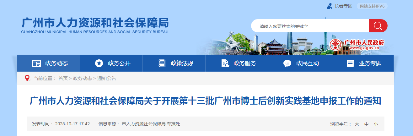 为深入实施创新驱动和人才强市战略,进一步加强我市博士后人才队伍建设,根据《广州市博士后管理服务工作实施办法》(穗人社规字〔2024〕5号)相关规定,现就开展第十三批广州市博士后创新实践基地申报工作有关事项通知如下: