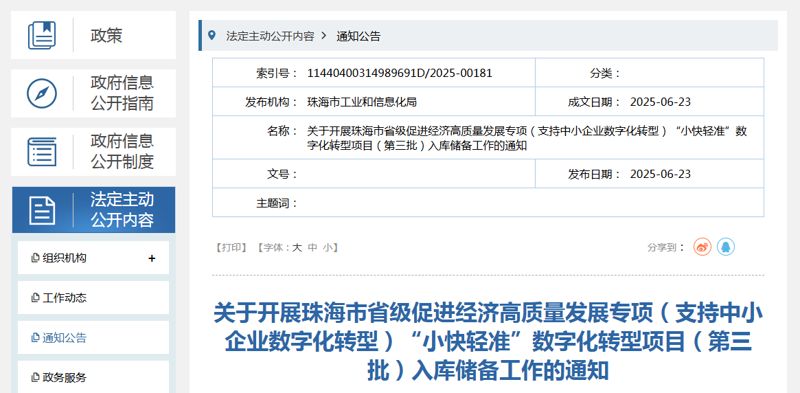 关于开展珠海市省级促进经济高质量发展专项(支持中小企业数字化转型)“小快轻准”数字化转型项目(第三批)入库储备工作的通知