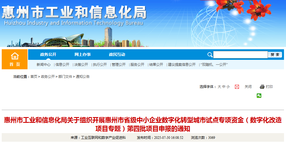 为加快推进我市省级中小企业数字化转型城市试点建设工作,根据《广东省工业和信息化厅 广东省财政厅关于做好省级中小企业数字化转型城市试点专项资金管理工作的通知》(粤工信工业互联网函〔2024〕57号)《惠州市工业和信息化局 惠州市财政局关于印发〈惠州市省级中小企业数字化转型城市试点专项资金奖补工作方案(修订本)〉的通知》(惠市工信函〔2025〕30号)《关于印发〈惠州市数字产业基地高质量发展若干政策〉的通知》(惠市工信〔2024〕240号)有关要求,现组织开展惠州市省级中小企业数字化转型城市试点专项资金(数字化改造项目专题)第四批项目(以下简称“第四批项目”)申报工作,有关事项通知如下: